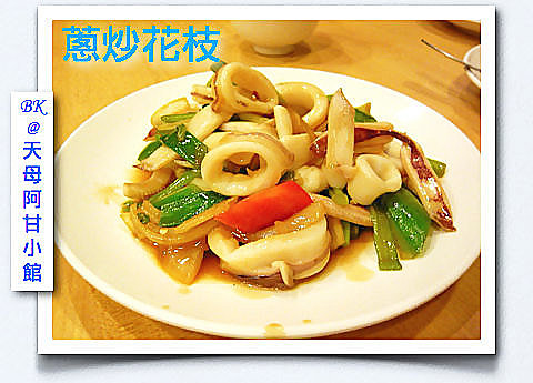 花枝切段,與青蔥、薑絲爆炒,甜甜醬油味很下飯