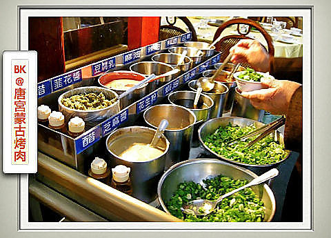 BK個人建議是:先去拿蒙古烤肉用的碗→到火鍋區的佐料台放些白糖→再去蒙古烤肉區拿肉菜。