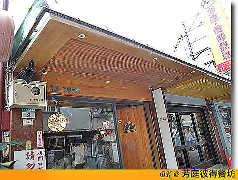 芳庭彼得餐坊位在熱鬧的忠孝東路SOGO正對面巷子,大門是木製門扉與一片落地玻璃窗,門上掛著彼得兔吊牌,預告著客人將與彼得兔相會腳步只差一步。