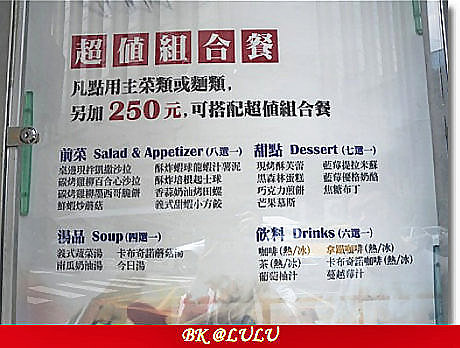 這天,選了LuLu餐廳現在推出的超值組合餐,感覺很豐富:點用菜單中的主菜類或麵類,加值250元,就可搭配8選一的前菜、4選一的湯品、7選一的甜點、6選一的飲料。